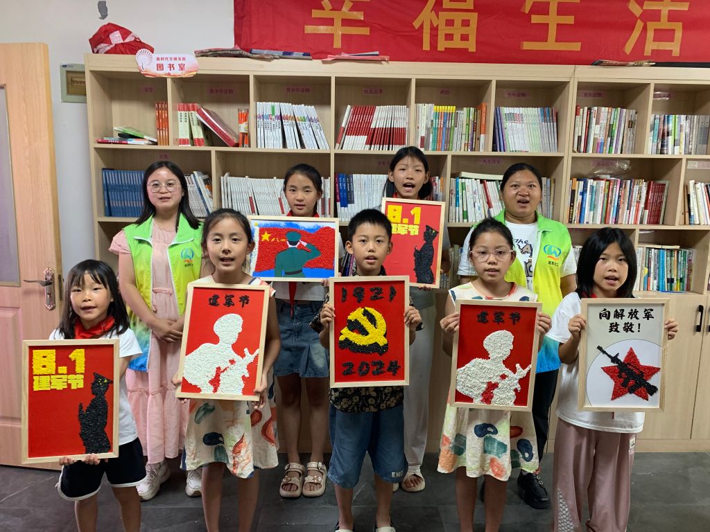 由于济南新旧动能转换起步区太平街道物产资源丰富,农业发达,社工带领孩子们制作献礼建军节的“八一”粮食粘贴画,既可以让孩子们真正感受到粮食的来之不易,又能让他们在创作中感受到国家的强大和自豪。经过孩子的不懈努力,粮食画终于制作完成了。随后,孩子们化身“红领巾”志愿者,跟随社工的脚步去往7名退伍老兵的家中,将自己亲手制作的“八一”粮食画送给他们,并一起听听守护家园、奋斗报国的故事。通过聆听退伍老兵的故事,让孩子们懂得有人付出守护,才能有我们的和平安稳;有人负重前行,才能有我们的自由欢笑。