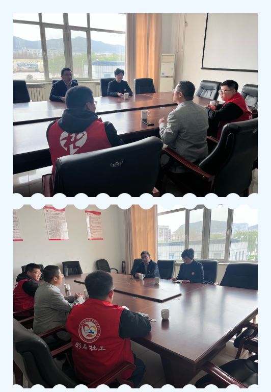 顾东辉一行首先参观了社工站的办公场所、个案工作室及文化墙建设,社工站站长曾庆敏就彩石社工站专属logo、马甲的设计理念及特色项目“1+1”惠彩服务包进行介绍,顾处长对社工站特色项目成效表示肯定。随后前往会议室进行座谈,社工站站长曾庆敏从社工站服务阵地建设、重点服务人群、服务成效以及亮点项目等方面进行汇报。