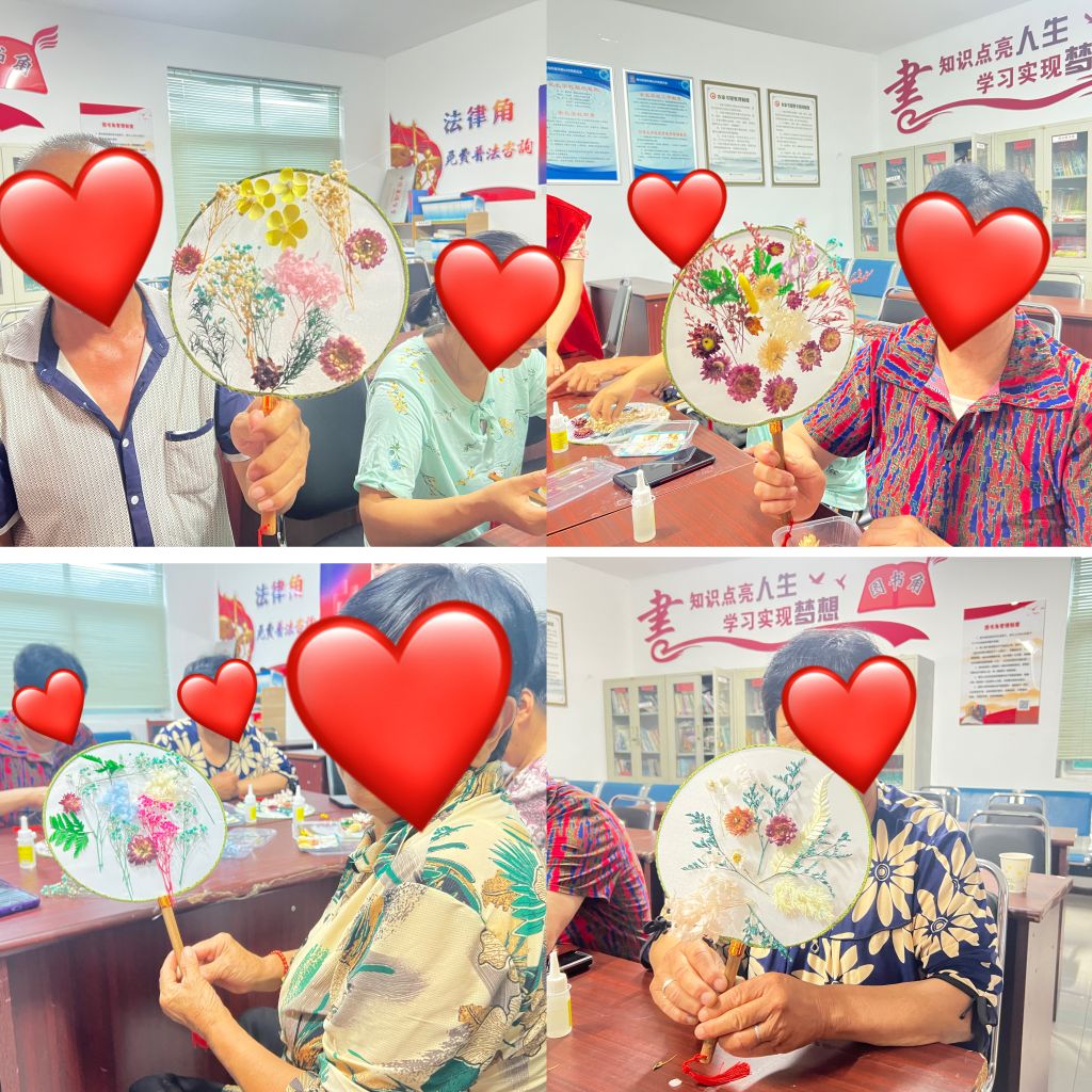 活动开展前期,社工站积极链接学校儿童志愿者,鼓励其参与助残志愿服务平台,同时链接村委工作人员,提前与辖区残疾群体进行有效沟通,协助他们积极参与小组活动。活动伊始,驻站社工先带领小组成员进行破冰游戏,“拉拉手,我们都是好朋友”,简单的游戏一下拉近了彼此之间的距离,虽然他们没能用语言表达内心的快乐,但是从开心的表情中能让我们深刻的感受到来自心底的温暖。随后,社工耐心讲解手工制作方法以及构图的注意事项,大家开始动手操作,从设计、选样、粘连、固定...小志愿者也尽职尽责有模有样的协助残疾人完成作品,经过近两个小时的努力,一把把精美绝伦、融入中国传统文化意境美、诗意美的团扇呈现眼前,看着自己制作的干花团扇,大家满满的成就感与获得感油然而生。