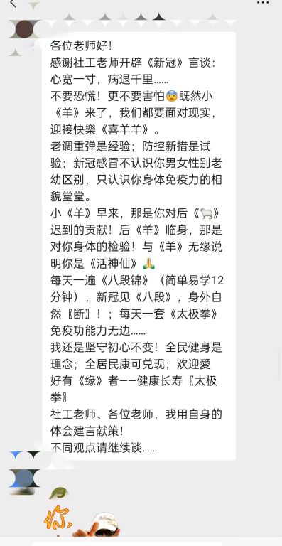 根据社会建构论,社会事实是不同的人对它的不同反应,因此大家生活在什么样的疫情生活是由大家一起塑造的,居民的态度和人际关系的构建对于社区发展具有重要影响。接下来,社工站社工则会通过线上理性讨论疫情话题增强服务对象的凝聚力和创造力;通过了解感染者的症状,为服务对象建立心理缓冲带。持续关注老年人的生活与心理健康,引导其客观看待事实,掌握科学健康防疫措施,形成健康正向积极防疫态度,筑牢疫情防控屏障。