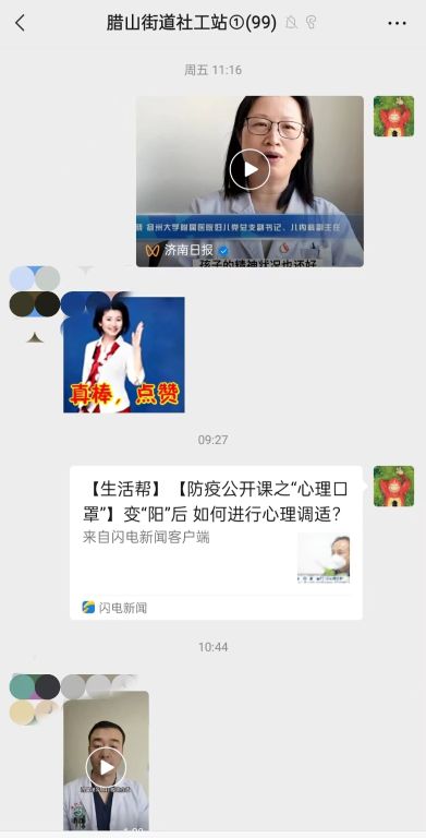 结合疫情形势变化,为关注辖区内老年人当前疫情形势下的生活状态及对疫情防控的态度,基于老年人普遍的文化水平、眼部功能的生理性衰老等特点,腊山街道社工站社工开展“科学防疫视频征集”线上活动,选择了视频这种有声有图的信息传递方式,保障服务对象参与的便利性。通过在微信群组内分享交流各自挑选的防疫视频内容,了解服务对象关注的,推动服务对象之间的情感联结,建立线上防疫互助交流平台。
