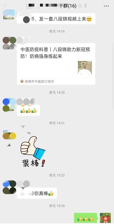 视频征集活动同样起到了维持关系的媒介作用,通过每天视频分享,从内容中感受大家关注的信息同样是一种互动。征集活动第二天,有的服务对象会不仅发送一些防疫视频,也会发送自己作为志愿者时录制的视频;也有服务对象提出请太极队负责人发一些八段锦视频进行学习;有的服务对象也会在自己所在队伍群组里面分享歌曲、戏剧等内容,以此来丰富居家的生活。同时,社工转发槐荫社工总站发布的互助用药倡议,鼓励大家药品共享,关注弱势,应对药品短时间内供应压力,形成互助共享,邻里为伴、邻里守望的和谐互助氛围,心手相牵,共克时艰!