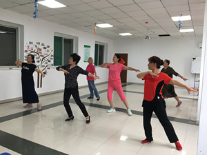 因长时间没有以这样的形式相聚,小组成员一见面便相互寒暄。活动开始前,阿姨们先做几组热身准备动作,伸伸腿、拉拉筋,为后面的舞蹈学习做好准备。因许久不训练很多舞蹈动作大家都记不太清楚,王恩慈阿姨便在一旁耐心地进行指导,帮助小组成员规范每一个舞蹈动作。待到小组成员都熟悉以后,大家一同反复练习,以完整地做好每一套舞蹈。社工也不忍打断阿姨们的学习热情,便借着阿姨们休息的时间,将活动规范及相关资料的填写跟大家进行说明,特别提醒阿姨们在活动过程中时刻注意安全。休息结束后,小组成员继续开始前面的舞蹈练习,熟悉的旋律在活动室持续回荡……