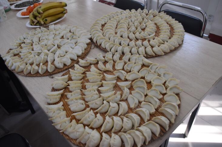 活动当天,槐村街社区居委会活动室俨然变身成了厨房。社区工作人员、社工、退役士兵和热心阿姨在由桌子临时拼凑成的操作台上忙碌着。有的在揉面,有的在擀皮、有的在包饺子。大家有说有笑,相互切磋包饺子的技巧,彼此比较着饺子的形状,活动现场热闹非凡。而在一边等待的老人们围坐在一起,说说笑笑,一片欢乐吉祥的气氛。