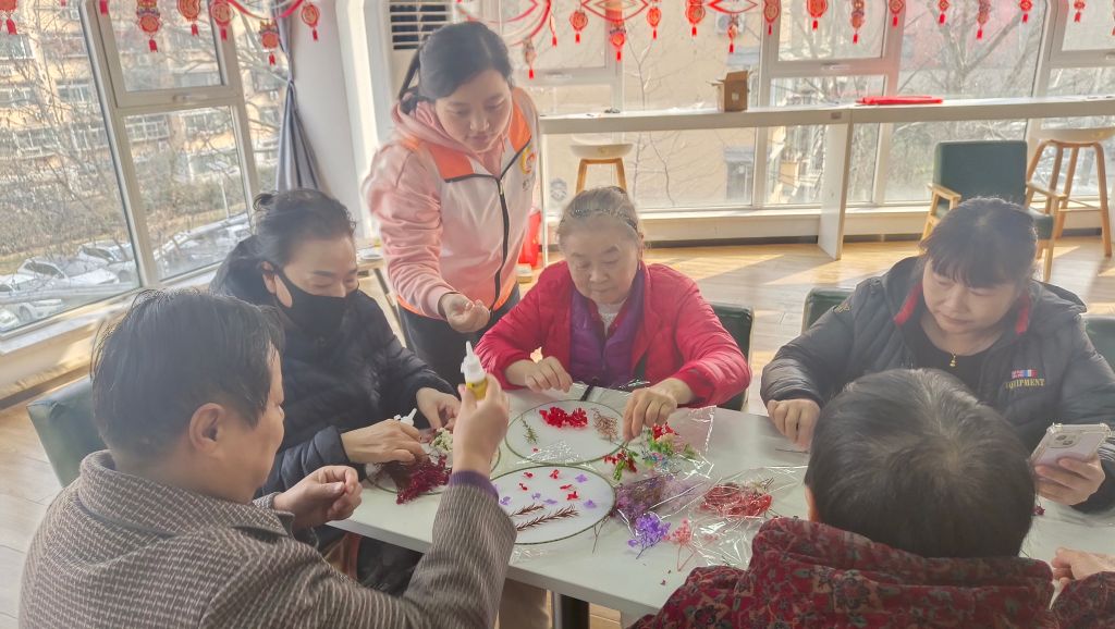 随后,社工及志愿者开始教授大家如何制作团扇。从扇面、干花的选择、粘贴等,每一个步骤都讲解得细致入微。老年居民们聚精会神地听着,不时提出自己的疑问和想法。在社工的耐心指导下,大家纷纷拿起干花,开始在扇面上粘贴出自己喜欢的图案。