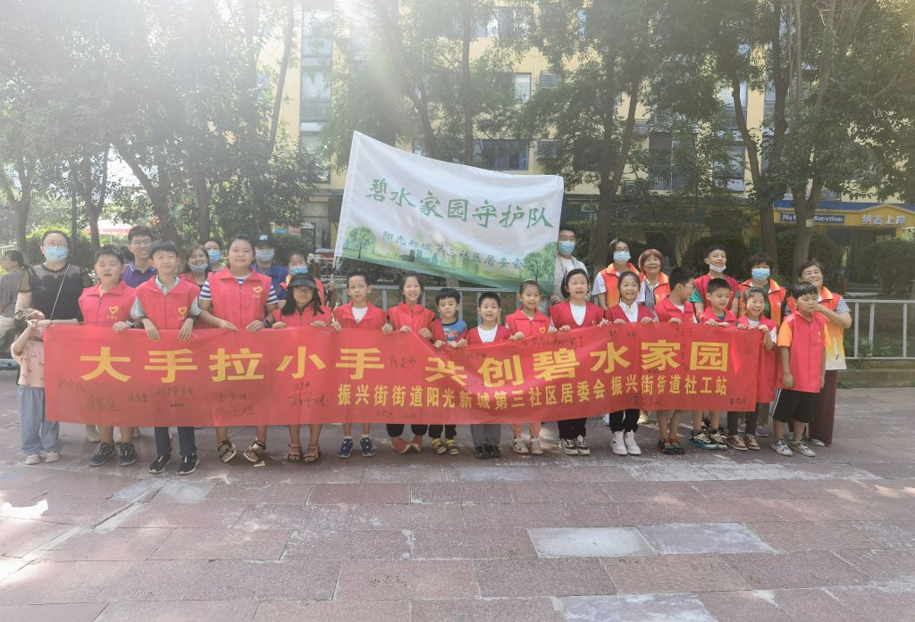 暑期接近尾声,振兴街街道社工站联合阳光新城第三社区居委会与碧水家园守护队开展了“大手拉小手,共创碧水家园”活动。碧水家园守护队是一支专注于河道清理、整治的社区社会组织。本次活动中,社工带领青少年志愿者一起参与到碧水家园守护队的河道两岸卫生清理工作中,切身感受河道环境的重要性。同时,在社工的号召下,青少年志愿者与碧水家园守护队的社区社会组织成员在横幅上一起签下自己的名字,为河道卫生改善、为社区环境美化贡献自己的力量。最后,青少年志愿者在宣传板上写上了自己的寄语,表达了自己对环境保护的热情。此次活动中,社工站整合社区资源,在代际融合中,充分发挥志愿者力量,为社区社会组织注入活力,为其进一步发展提供动力。