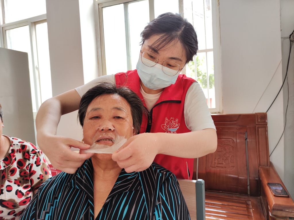 面部清洁、皮肤按摩放松、敷面膜、锁水保湿、涂抹素颜霜,全套步骤下来,老年朋友们纷纷表示皮肤变得清爽、舒适,整个人都感觉精神了许多。孟阿姨说:“我平时很少护肤,今天敷了面膜,感觉整个人都容光焕发,真是太感谢你们了!”