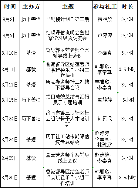 (1)8月份,趵突泉街道社工站联合社区、社区志愿者、社会慈善资源等开展活动4次;5个社区社会组织参与社区服务与治理;开展困难群体帮扶活动4次124人次;社工站参加督导培训10次,社工站站长参加联席会议2次,机构月度例会1次; 全员参加历下社工站2021-2022年终期评估汇报。
