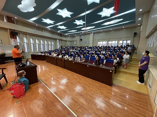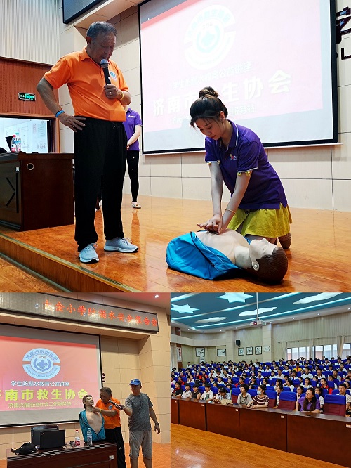 济南市救生协会讲解老师将如何预防溺水以及发生溺水后如何施救等问题做了详细讲解,讲解过程中还邀请同学们上台亲身演示如何急救。“如果你不慎溺水,先不要慌张,应屏住呼吸、双腿并拢、双手合十穿过头顶、放松自己,让身体自然浮起。接着在双脚不动的前提下,双手重复做几个向两边划水合十穿过头顶的动作,让自己游到岸边。”