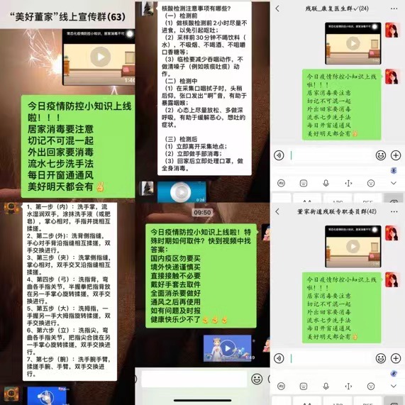 网络宣传是疫情防控宣传的重要部分。社工站运用专业知识,充分利用互联网传播效率高、覆盖范围广、时效性强的特点,建立“美好董家”线上宣传群,开发“社工+互联网+残联+志愿者”联合宣传模式,开启与辖区机关干部、村民群众以及特殊群体的线上互动。