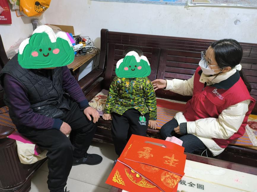 社工要把每一位服务对象都放在心上,把饱含祝福心意的礼物送到每一位弱势困境服务对象家中,把心意传递到每一位服务对象心中。在提前进行了电话联系之后,腊山街道社工站社工带着新年礼物来到了两位弱势困境儿童的家中,赠送了由社区社会组织志愿者书写的新年对联、福字,同时社工与服务对象困境儿童家长进行了访谈交流,提供社工专业层面的关心、倾听和支持,认真了解服务对象的近期生活情况,聚焦困境儿童当前的需求与所面对的问题,更好地为服务对象提供针对性的服务。