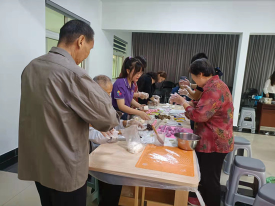 月饼DIY。社工、社区工作人员和社区居民共同制作手工月饼。活动中,居民将揉好的面皮,用果蔬粉调色,再加上满满的馅料,往模具中一放一按,一个个晶莹透亮、极具创意的冰皮月饼完成。居民亲手制作了一个个寓意团员和美满的月饼,感受到了社区大家庭的温暖。同时,通过互动交流,拉进了社工与居民的距离,增强了彼此的信任。