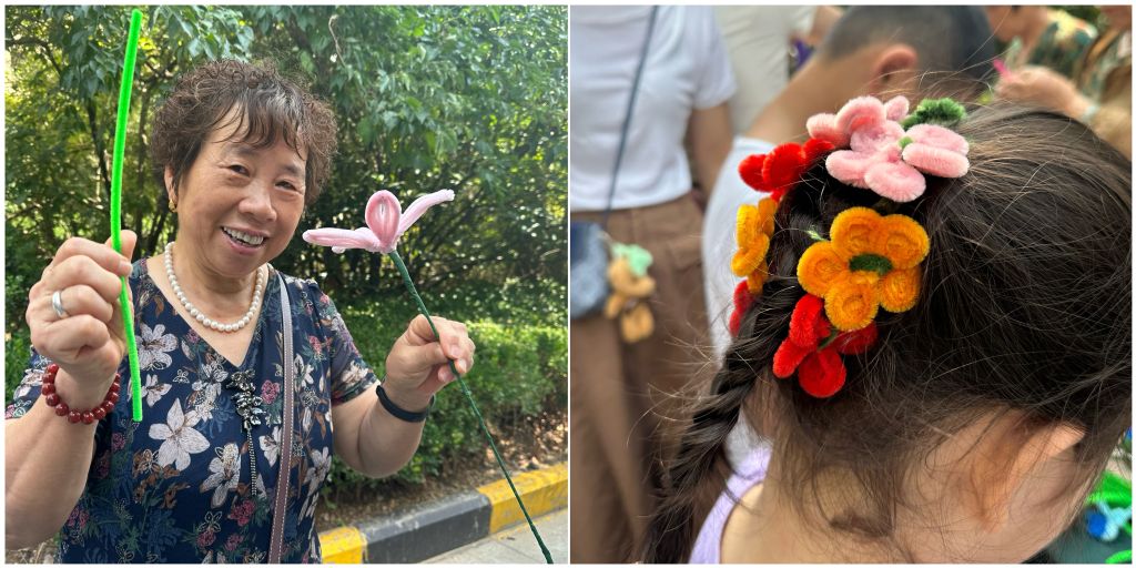 社区老年人们用扭扭棒扭出自己想要的花型