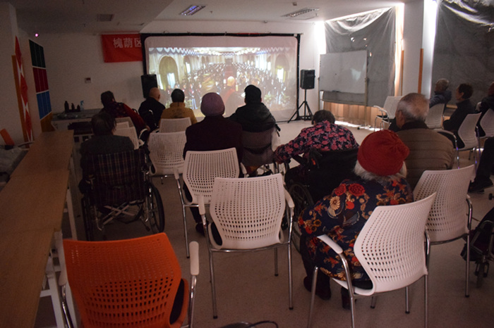 活动伊始,社工去各楼层通知老人今天观影内容,老人陆续到达活动室。下午两点半,电影准时放映,影片讲述了从抗日战争结束到1949年中华人民共和国建国前夕发生的一系列事件。老人们伴着慷慨激昂的革命乐曲、恢宏磅礴的历史画面,仿佛自己就置身于那段关乎中国命运转折的伟大时期,大家的表情庄严肃穆,提起十二分精神的看。在坐的老年人也无不为之感染,有人不由地发出感叹:”说的好!”我也沉浸在剧情里,以前无法体会,我想这就是课本上常说的革命乐观主义精神吧。观影完毕后,听见有老人发出感慨,有了毛主席,中国慎幸!民族慎幸!