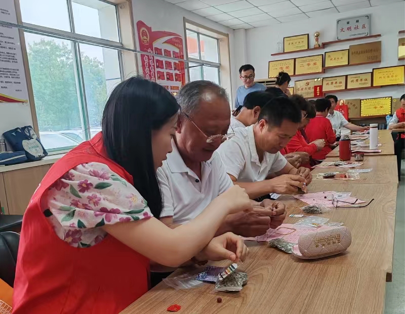 在室内,社工和志愿者们还为居民准备了香囊DIY材料。在古代,人们认为夏季疾病多发,香囊中的香料具有驱虫、辟邪、消毒等作用,佩戴香囊可以保护自己免受疫病和邪祟的侵扰。社工亲切的与居民交流制作香囊的方法,讲解香囊的作用,询问居民生活中的健康需求,以便今后工作中更好的为居民服务。在活动间隙,社工向前来参加活动的居民发放移风易俗倡议书,提醒居民近期天气炎热,外出注意防暑降温。