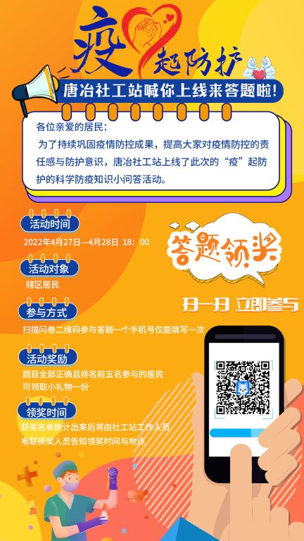 为进一步普及新冠疫情防控知识,增强防护意识,引导社区居民正确对待疫情,科学做好防护,4月27日——28日,唐冶街道社工站开展疫情防控系列活动——‘疫’起防护—唐冶社工站喊你上线来答题啦。