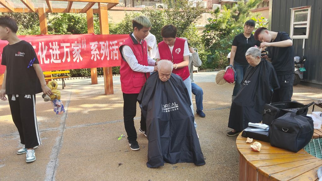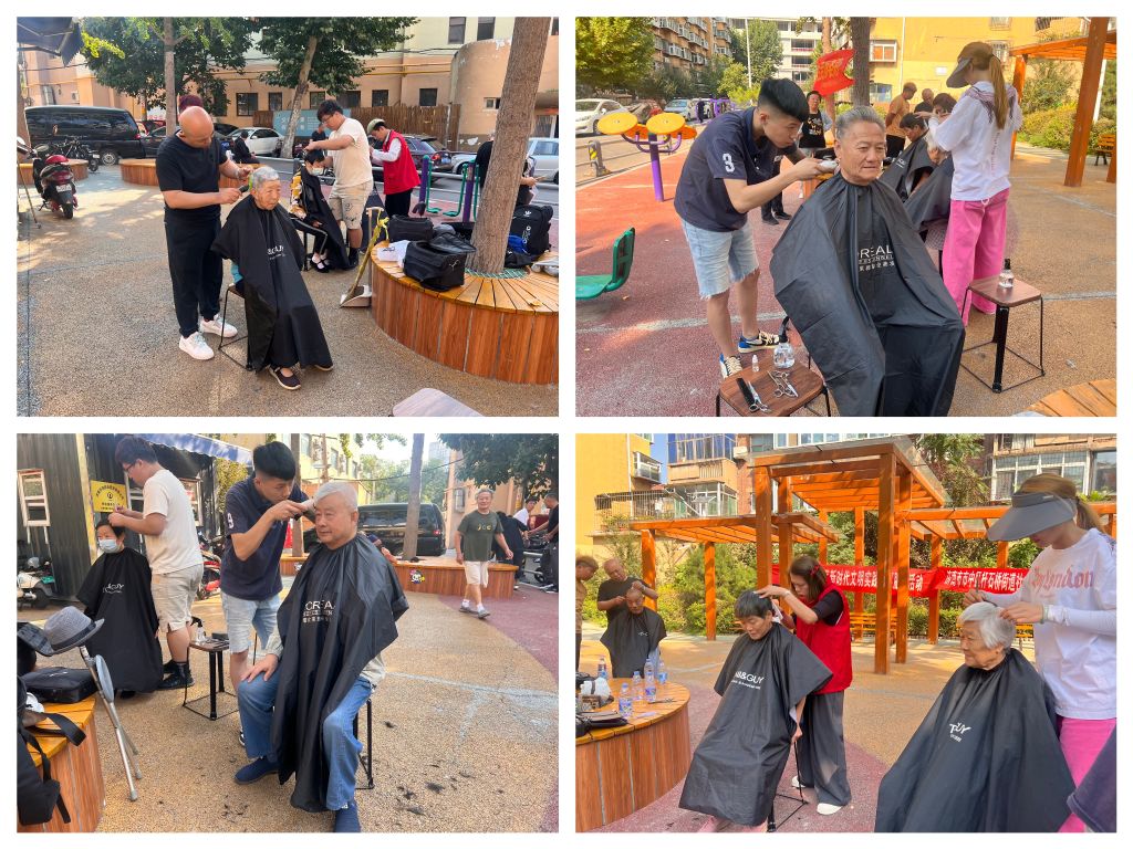 活动当天,在社区广场为社区老年人专门设立了剪发区域,准备了足够的剪发工具和材料,邀请了美人制造化妆培训学院理发师志愿者参加活动。活动现场,理发师志愿者先对每位居民进行简单的咨询,了解他们的理发需求和期望,随后,理发师志愿者根据他们的要求进行剪发和造型。整个过程中,志愿者们认真细致地与每位居民沟通,确保他们满意的结果。