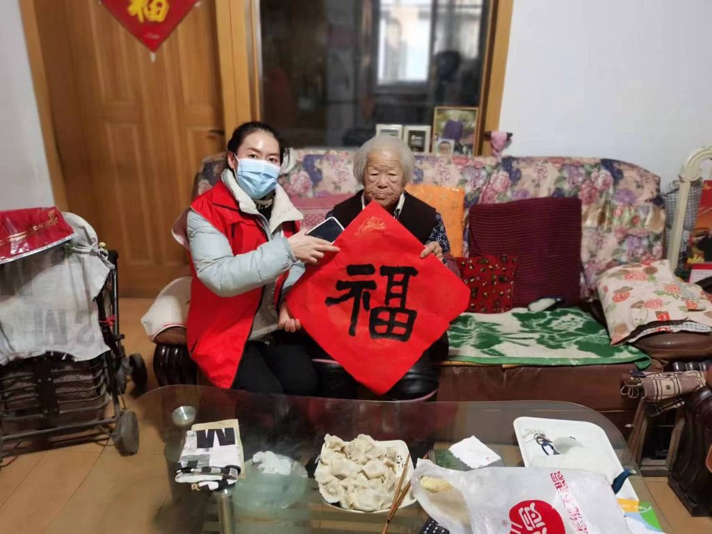 当水饺煮熟后,社工将热腾腾的水饺送到高龄独居老年人的家中,并送上写好的福字及诚挚的问候。社工陪着老人聊家常,了解其生活中的困难,将链接的“一对一”帮扶志愿者介绍给老人,让他们感受社会的关爱及节日的祝福。