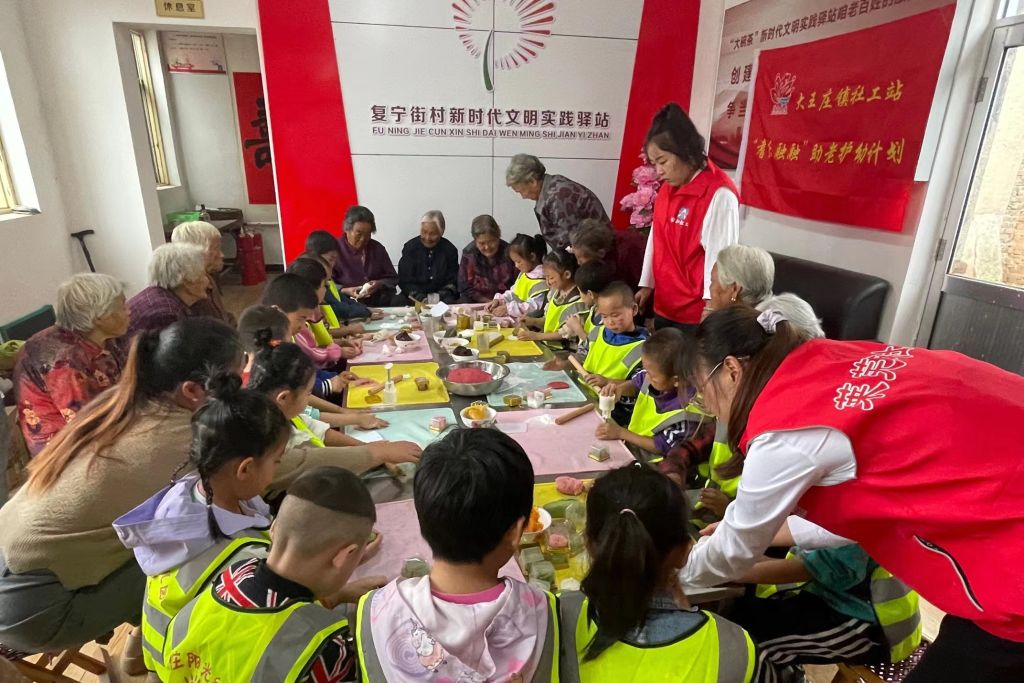 又到一年中秋时,每逢佳节倍思亲。正值“中秋、国庆”双节来临之际,为弘扬中华民族传统文化,积极倡导辖区尊老爱幼的良好风尚,营造浓厚的节日氛围。9月27日,大王庄镇社工站联合大王庄镇阳光幼儿园、村两委、志愿者、新时代文明实践站前往复宁街村幸福院开展“童梦中秋,嗨翻国庆”中秋节主题活动,让辖区留守老年人、困境儿童在体验和探究中进一步感知、了解中秋佳节的来历和习俗,以实际行动体现对辖区“一小一老”的节日关怀。