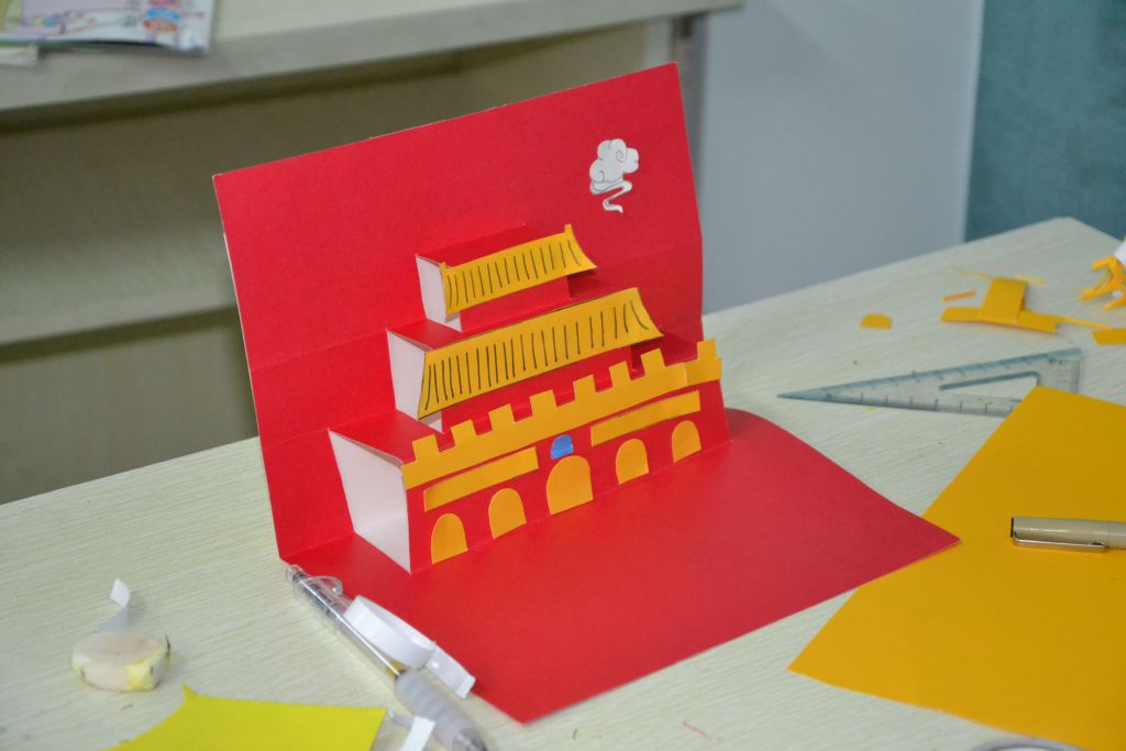 随后,社工为孩子们分发制作立体天安门的材料并讲解如何制作,要想把天安门完整地“搭建”完可没那么容易,每一个线条,每一块砖瓦,这其中的顺序排列也有讲究,错一步则整个模型呈现不了立体状态。孩子们都以最认真的态度对待此次活动,社工也十分耐心地倾听并从旁协助,有的低头专注制作,有的相互交流、研究示意图,有的则请志愿者协助,从铺平、压实、翻折,大家一步一个动作的进行着每一步,历经一个小时,一座座立体“天安门”展现在大家眼前。