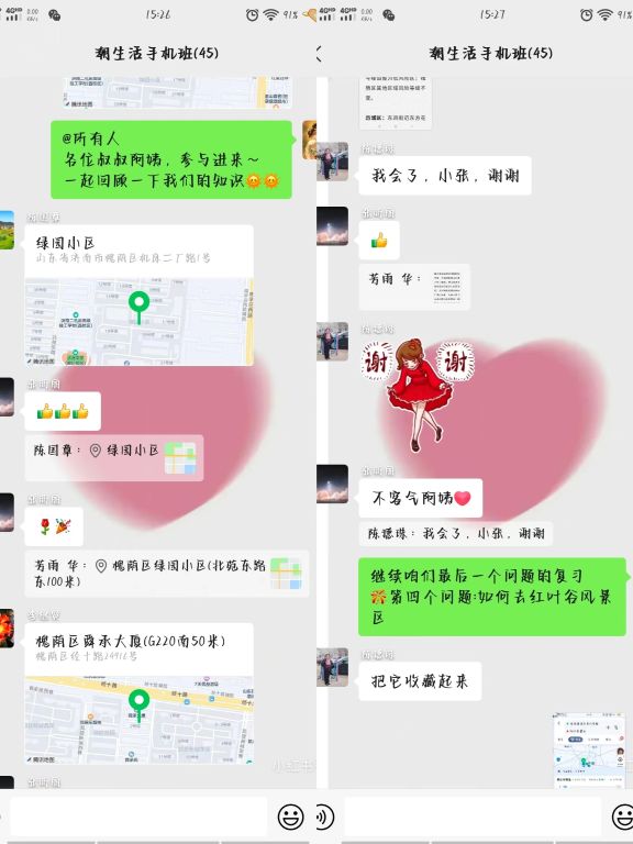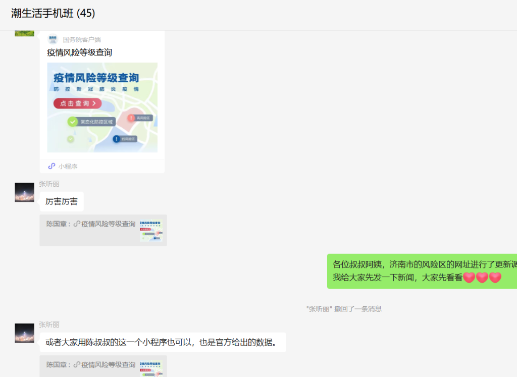 通过前期的内容预告,在上午9点整,大家通过“早安表情包”拉开序幕,大家一波表情包操作将小组情绪点燃。接着以“发送自己的地理位置”的问题,让小组成员回顾旧知识点。在遇到遗忘的板块时,小组成员及时提出,社工对其问题进行了一对一的解答,做到疑问不留空,现问详解答。就当下疫情,社工带领老人学习了如何用微信小程序“疫情风险等级查询”和“使用地图出门”,小组成员在群中纷纷表示,小程序学习对现下情况十分受用。社工在与老人进行交流时,鼓励老人在家中也要注意运动饮食,对大家遵守小组契约进行肯定,为他们这种好学的精神点赞。