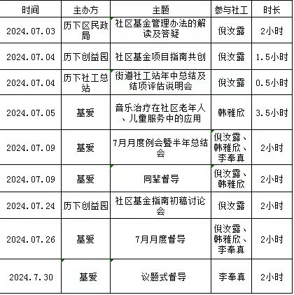 本月,社工站参与督导、培训、会议共计9次。其中,站长倪汝露参与7次,共计12小时,社工韩雅欣参与4次,共计9.5小时,社工李奉真参与3次,共计6小时。