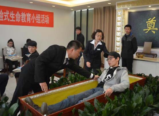 一曲舒缓的音乐,把大家带入了“若是别离”的氛围中,各小组成员用红蓝铅笔书写了自己的生命卷轴。在预立遗嘱和分享遗嘱的环节中,大家听着略带哀伤的音乐,书写自己临终前需要去一一交代的事情。当两个学员分享自己的遗嘱,在场地每一个人被深深触动,潸然泪下。“模拟葬礼”环节中一名勇敢的学生代表,躺进了棺椁里,依次接受同学的深情告别,带队老师和参加体验的学生几次哽咽失声……。