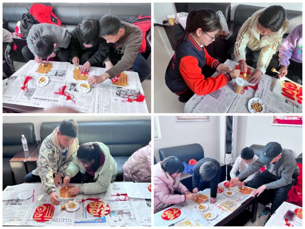 制作过程中,有些困境儿童性格比较内向、放不开,我们的小志愿者发现了这一情况,主动来到他们中间,与他们沟通分享“经验”,大家也时不时交谈着拓印技巧,还有热心的小朋友互相帮助一起制作完成;随后,每个人都展示了自己的作品,通过一起制作与分享环节,大家慢慢的熟络起来,孩子们表示要把“福”字带回家挂上,自己制作的太有意义了,非常喜欢这种文化实践活动,大家纷纷送上了祝福语:愿新的一年身体健康、事事顺利,现场一片欢声笑语; 最后,社工将提前准备好的瓜子、橘子等水果分给大家,大家以唠家常的方式,相互交流近期的生活学习情况,假期如何安排学习计划等等,社工也给出了适当的建议,为困境儿童营造安全、和谐、健康的成长环境。