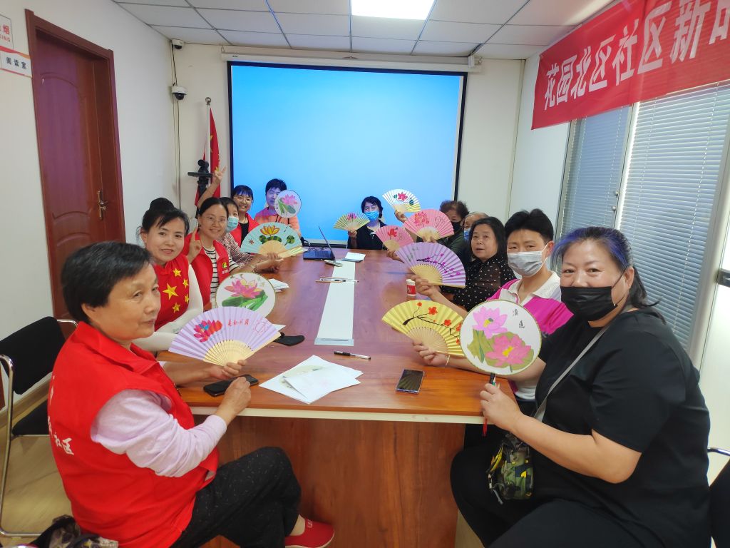 为丰富社区居民精神文化生活,增添老年人的生活乐趣,2023年5月16日下午,洪家楼街道社工站联合花园北区社区新时代文明实践站、洪家楼社区社会组织联合会组织老年居民开展了“巧手绘青莲 清风润民心”手工扇子绘画活动。