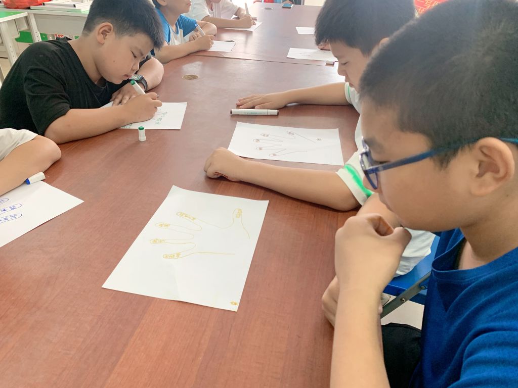活动一开始,社工们首先通过热身游戏“名字接龙”引导组员们进行自我介绍,活跃了小组气氛并消除了组员之间的陌生感和疏离感,初步建立起良好的互动关系。然后让组员将自己的手贴在白纸上画出自己的手型,并在画好的手指上写上兴趣爱好,手心写上参加小组的目的,之后社工将白纸收起来,抽取一张念出来,让组员猜猜是谁,组员们都回答正确。