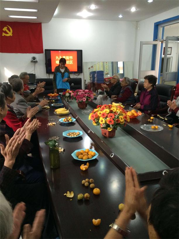 茶话会以重阳节为活动主题,活动开始先由社工进行致辞,并送去了真挚的节日祝福。在活动室的会议桌上社区工作人员摆满了各种水果,大家围坐在一起, 观看电影《建国大业》,并品尝居委会为老人们准备的节日蛋糕,活动气氛积极热烈,一片欢声笑语。