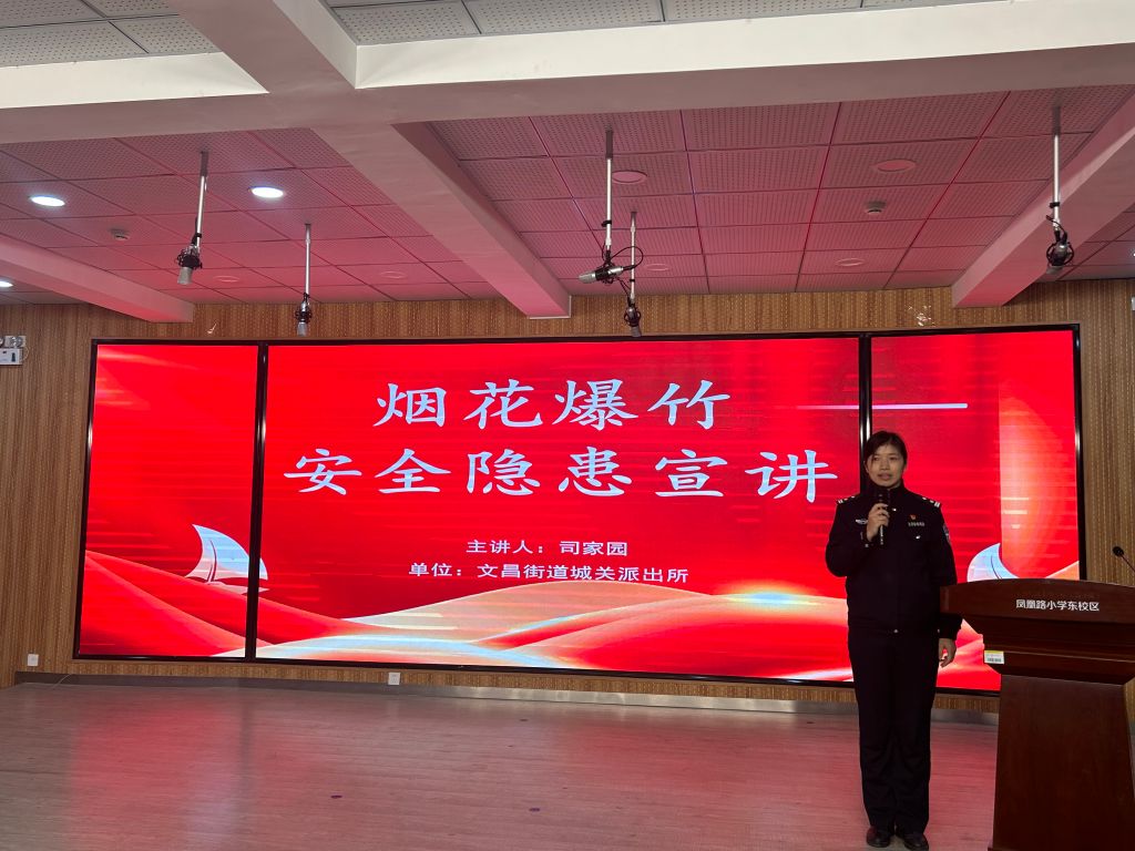 活动中,文昌街道城关派出所民警司家园首先进行烟花爆竹安全隐患宣讲,向学生、教师群体讲解燃放烟花爆竹的危害、呼吁大家应该自觉遵守相关法律法规,不购买和使用非法烟花爆竹产品,如遇违法违规行为,可以进行劝阻或报警。随后由学生代表宣读倡议书,并为宣传小卫士代表发放聘书,鼓励他们用实际行动共同保护环境、建设美丽家园。文昌街道社工站站长对线上活动操作流程进行讲解,鼓励儿童参与线上活动,通过“线上+线下”两种方式相结合有效提高儿童与家庭的活动参与感,促使活动效果最大化。活动最后,凤凰路小学副校长魏燕进行讲话,提升青少年安全意识和能力,老师、学生代表在倡议条幅签字,用实际行动践行环保行为。