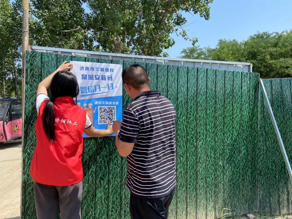 活动开展过程中,社工站工作人员在建筑工地和企业醒目位置张贴济南市欠薪维权泉城安薪码,并现场向农民工演示“安薪码”操作流程。“泉城安薪码”是济南市人社部门推出的“济南市欠薪维权二维码”,劳动者遇到拖欠工资等侵权问题时,通过微信扫码填写姓名、手机号、身份证和维权诉求等内容,即可完成直通劳动监察部门投诉举报。按照属地管理原则,劳动监察部门收到投诉信息后,第一时间将投诉信息通过平台流转到属地政府、行业部门及项目单位联动处理,并向投诉者推送办理进度信息,简化了劳动者维权程序,实现诉求“码”上反映“马上办”,维权投诉“零跑腿”。