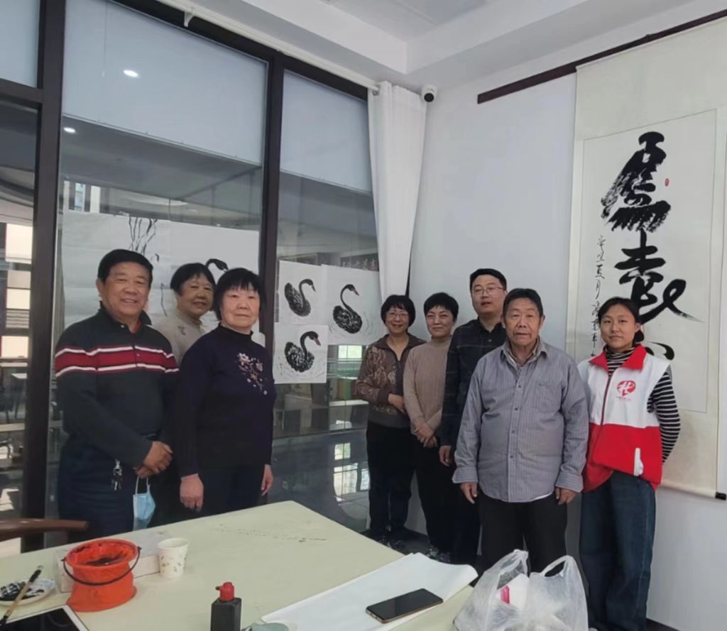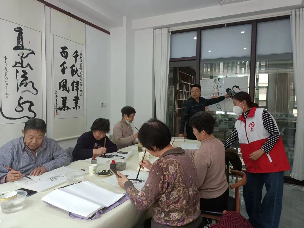李老师通过理论知识讲解和绘画步骤演示的形式,展示黑天鹅的画法和技巧。授课结束后,老年学员们在李老师的指导下开展国画练习。学员们在老师和社工的帮助下逐渐掌握书法技巧。从一开始的无从下手,到后面的逐渐熟练。老年学员们言笑晏晏,商量着将自己的作品带回家向家人展示,并表示练习国画不是一蹴而就的,需要勤学多练,“要是每个周能开两节课就好了,来画画心情舒畅。”活动中,社工作为观察者,积极发现并挖掘老年群体中的骨干成员,协助壮大社会组织队伍,引导老年群体为社区治理助力。