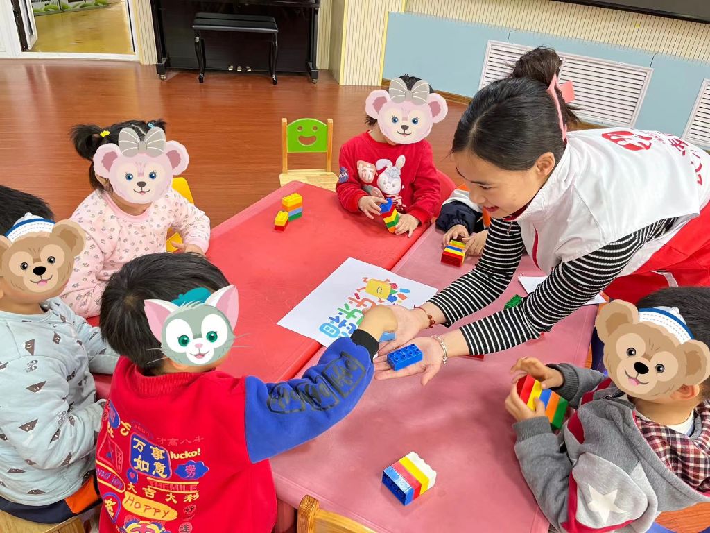 社工引导小朋友说出乐高积木的颜色
