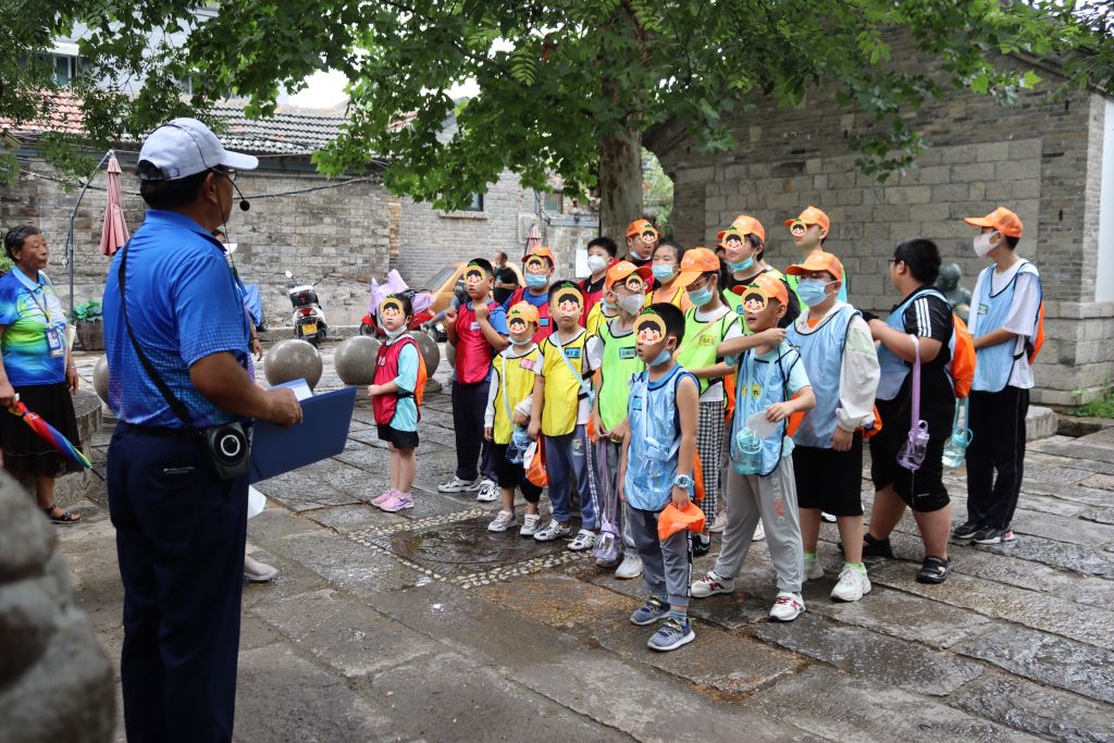 项目组通过资源链接到老济南记忆馆志愿服务队带领夏令营队伍走进泉城,聆听老济南故事,感悟红色文化。中午儿童们吃过丰富的午饭,休息片刻,便来到曲水亭街开启探城之旅。老济南记忆馆红色志愿宣讲员如数家珍般的讲述着在这里发生的革命先烈的故事,儿童们听得津津有味,还会时常向宣讲员提问或感叹“人怎么可能成为尖刀呢?”“辛锐是个大英雄!”不知不觉间便走进了百花洲。