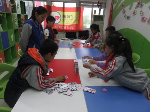 活动伊始社工将组员分为两组,每组一副扑克牌,组员们拿到扑克牌后进行讨论分工,确定以“你折、我叠、他搭”的方式,搭建“纸牌塔”。活动过程中,其中一组眼看第二层就要完成,搭的组员手一碰,塔全倒了。其他组员看到此景,没有责备队友而是安慰鼓励、出谋划策、团结合作、总结经验……终于经过全体组员的不懈努力,一个高高的“纸牌塔”搭建成功。