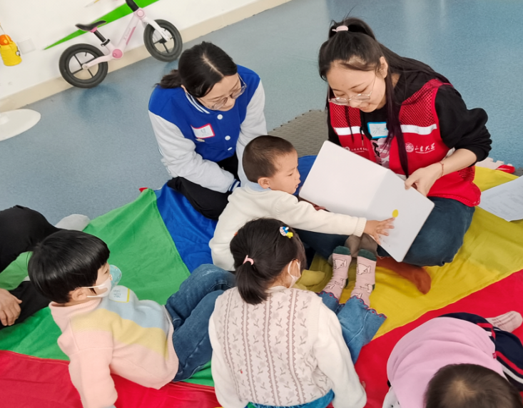 活动以游戏“击鼓传花”拉开帷幕,祖辈照料者、儿童、社工、志愿者围圈而坐,在活泼的音乐中通过增加儿童之间的交流,活跃活动气氛。在儿童彼此认识后,社工便借助彩虹伞引出本次活动的主题——色彩学习。鲜亮的颜色很容易吸引儿童的注意,他们随着社工的指令笑着跑到彩虹伞的对应颜色区域,为自己获得奖励印章高兴拍手。儿童初步认识颜色后,社工由浅入深,先后拿出绘本《点点点》和乐高积木,在阅读绘本的过程中引导儿童伸手点对应的颜色,让儿童和祖辈照料者一起将乐高积木进行颜色的分类和简单的拼搭,不断增加儿童对色彩的认知和熟悉度,促进儿童的言语表达和肢体动作的发展。