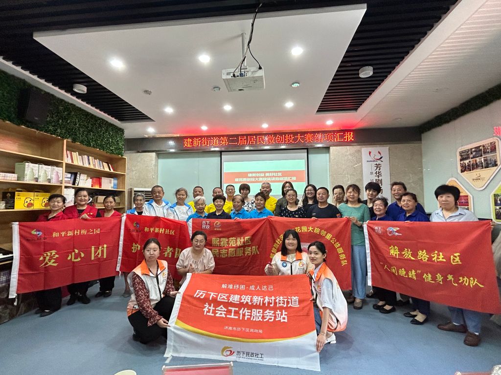 7月5日,在历下区民政局、建筑新村街道办事处的支持下,建筑新村街道社工站、建筑新村街道社区社会组织联合会联合主办的“创益建新,美好社区”第二届居民微创投大赛结项仪式圆满结束。建新街道党工委副书记李辉,建新街道社事科科长满意,解放路社区党委书记孙薇,和平新村社区党委书记薛倩,熙霖苑社区党委书记王承谦,花园路社区党委书记李娜,历下社工总站曹书丽,基爱社工总干事李明叶,恒丰银行济南分行营业室负责人李小雨受邀出席活动。特邀和平新村社区小小电视台全程录制。