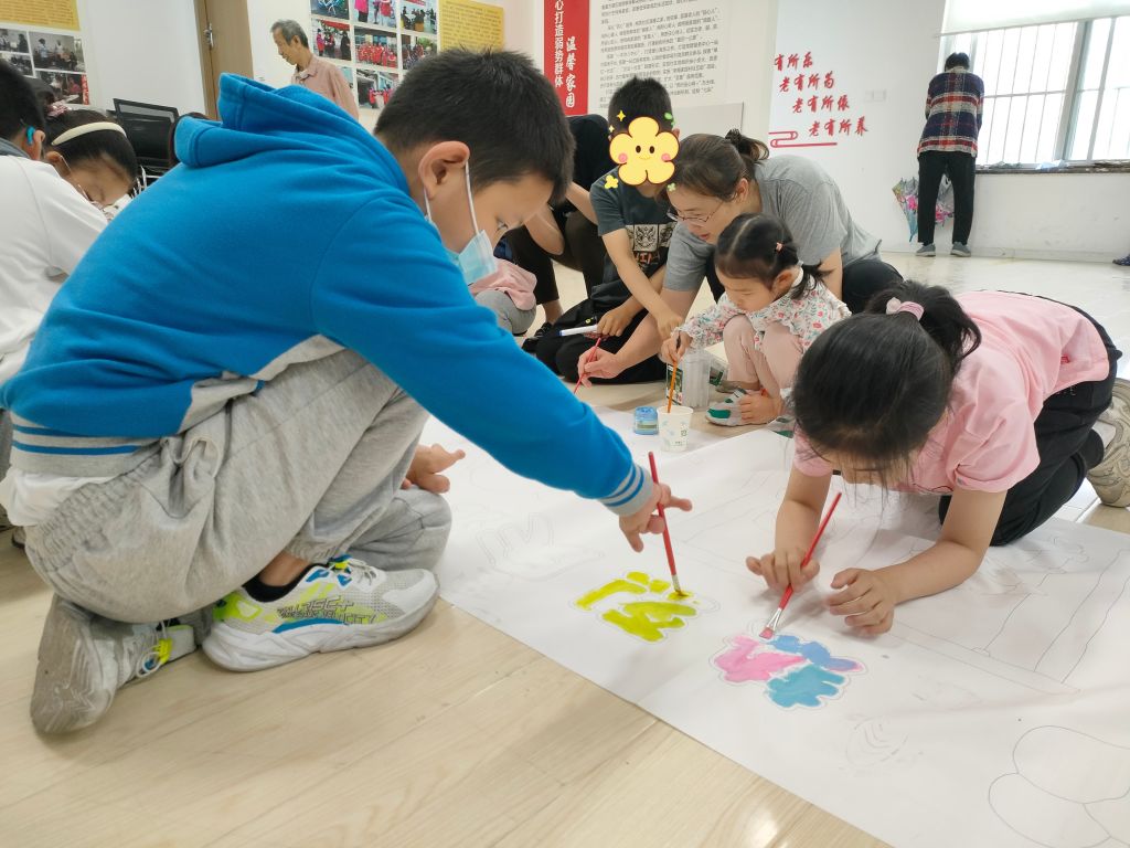 随后,社区工作人员将颜料、画笔等分发下去,小艺术家们用自己纯朴的童心和稚嫩的小手在画卷上认真地绘制着。一支笔一抹彩一点创意,孩子们挥动着画笔,肆意描绘着一个美丽的世界,长长的画卷被赋予了五彩的生命力。一旁的社工、社区工作人员和志愿者则当起了孩子们的小助手,帮助他们铺平画布、传递彩笔,偶尔给出建议指导。不一会儿,白色的画卷就变成了一件色彩斑斓的艺术品,孩子们的脸上露出了开心的笑容,这是他们用美丽童心绘制的专属节日礼物!