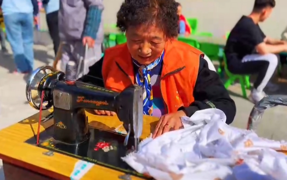 (公益缝纫小组志愿者帮助居民修补衣服)