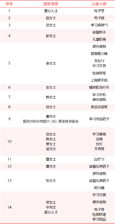 2022年7月27日,第六期“圆梦微心愿”画上了圆满的句号。截至目前,共有32名困境儿童收到了来自社会各界的圆梦使者为他们资助的心愿物品。(详见下表)