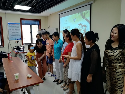 首先由医务社工徐铭静从护童意识、护童知识、护童技能三个方面开展了护童教育家长工作坊,让家长们更加系统地了解了护童安全知识,增强了保护儿童安全的责任感。然后,由心理科医师周璐讲解了亲子关系中应注意的心理问题,并开展了以“感受爱”为主题的团体心理辅导,以游戏互动的方式让参与者敞开心扉、增进感情。其中的“猜猜我在哪儿”环节特别受欢迎,小朋友蒙住眼睛去摸家长的手,看能否找到自己的家长。有个小朋友一下就摸出了自己的奶奶,奶奶感动地眼泛泪花,心里别提多美了,她说“孙子从小跟着我,睡觉都拉着手,所以他能一下摸出是我的手来”。很多家长也深有感触,说出门时只是随意拉着孩子的手,并没有什么特别,没想到孩子能仅仅通过摸手就能分辨出哪个是家长,我们不经意的付出已经在孩子的成长过程中留下了不可抹去的印记,换成是家长找孩子的手,还真不一定能找到,以后一定更加用心地陪伴孩子,珍惜和孩子相处的美好时光。