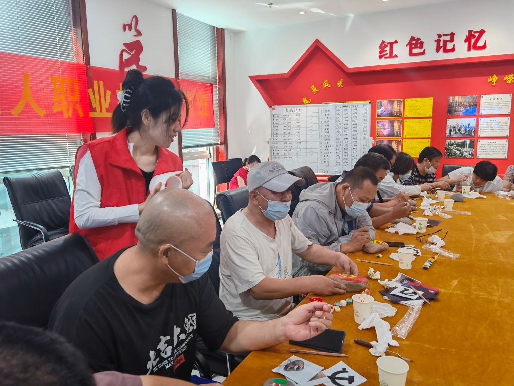 整个活动中,每一个参与其中的残疾人人都认真地参与石上作画,有的残疾人手不停颤抖、有的残疾人手脚不算协调、有些残疾人无法快速学会作画,但是在场的所有残疾人都认真参与、低头作画,将眼前的一块块鹅卵石绘制成一块块漂亮的工艺品。社工一直在现场鼓励残疾人,帮助手脚实在不灵敏的残疾人勾勒线条,随着大家的努力,一块块鹅卵石绘成漂亮的工艺品。