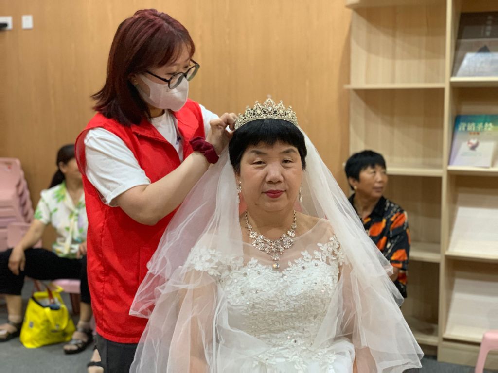 活动当天早上,老人们陆续来到社区,在社工和志愿者的帮助下,换上婚纱、西装或中式礼服,个个神采奕奕。社工们对着奶奶连连夸赞,老人们脸上洋溢着幸福的笑容。“这一下起码年轻了20岁!”65岁的徐奶奶笑着对老伴王爷爷说。