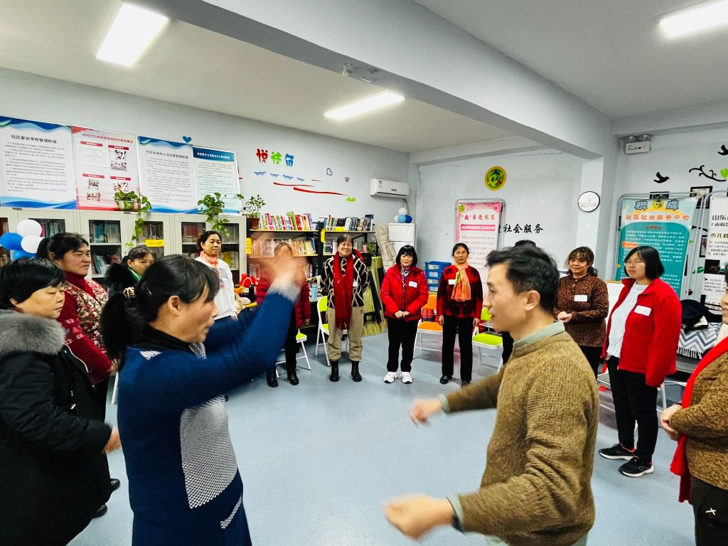 为了活跃气氛,调动情绪,老师带领大家玩了“wushi”节奏传递,大家围成圈,按顺序用声音与动作依次传递,当出现做错的成员时,该成员将自己的口令重置,继续游戏。数轮过后,大姐们逐渐熟悉了游戏规则,不仅自己能够迅速做出反应,还能够立竿见影地监督他人,沉浸在“wushi”游戏中,如鱼得水,引得阵阵欢笑,朗朗悠扬。