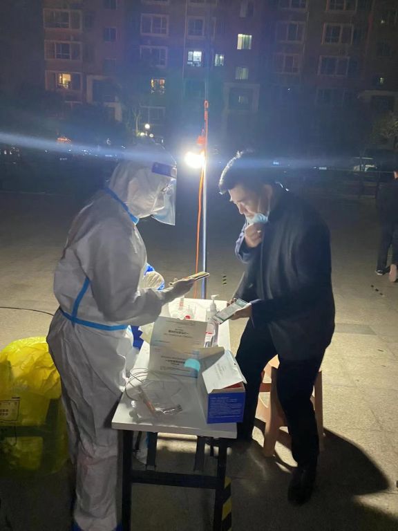慢慢地我的业务就熟练了,就开始帮助新加入的志愿者,维持秩序很多工作都干了起来。在进行核酸检测工作中,业务已经很熟练了,我主要负责西门物资调配,下午遮阳问题,晚上照明问题,缺人缺物资领取问题,以及做完核酸的收尾工作,在这期间我们还总结经验先通过十人一组进行核酸检测,后十人第二组登记信息准备,从第一天到晚上十点西门两组只能做2200人,到第三天不到九点就可以做完2600人。