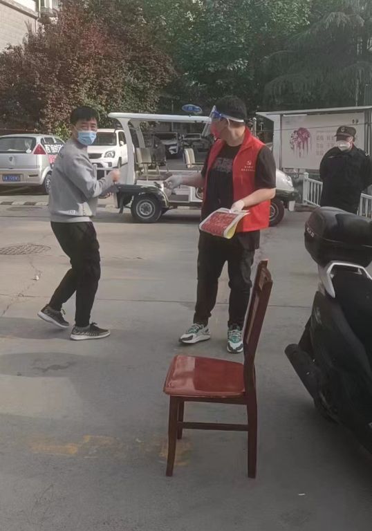 邢永斌,泉城花园社区居民,自4月26日至5月3日社区解封,一直参与在社区疫情防控工作中,在与邢老师的微信聊天中,邢老师说道“物资点、核酸检测、秩序维护、社区各种疫情防控群我都在”。