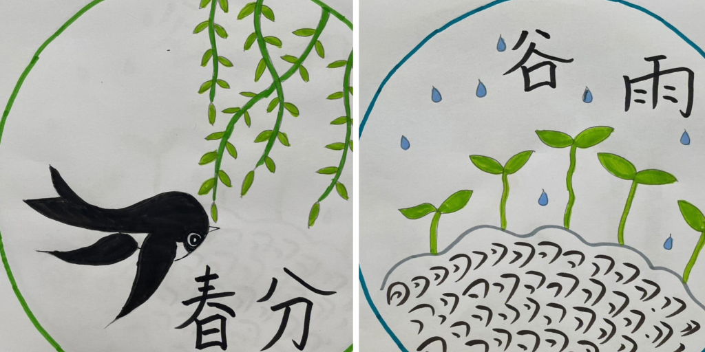 “老师,小燕子飞回来了就是春天到了是吗?”、“老师,谷雨的时候一定会下雨吗?”孩子们无拘无束地伏在画卷上,挥洒天马行空,一条线、一点墨,处处闪耀着孩子们创作的灵感,他们用笔触诠释祝福,用色彩拥抱生活。