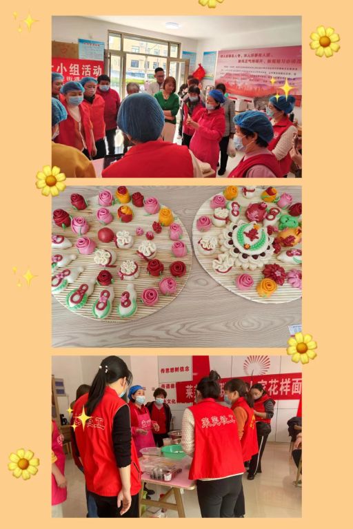 活动现场,小组组员们看到栩栩如生的花馍,热情高涨,跟着面点师傅的步骤、指导,也做出了一朵朵美丽的花馍。全部成员做完后,一起将做好的花馍放入锅中蒸熟。在等待的过程中,成员们仍在一直讨论制作方法,回家准备大显一番身手。